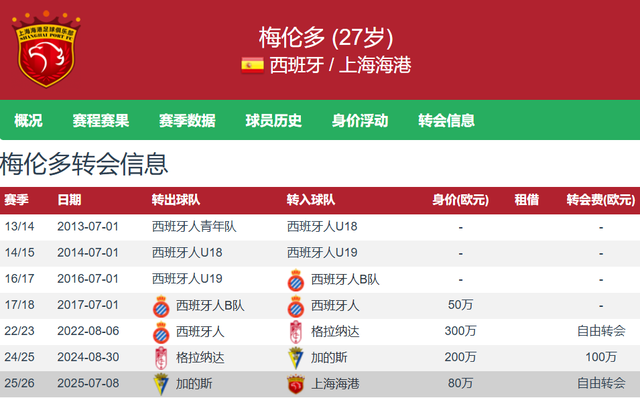 据德转数据显示,现年27岁的西班牙前腰梅伦多于今年夏窗以自由转会的方式从加的斯加盟上海海港,这笔交易无需花费上海海港转会费。梅伦多出自西班牙人青训,与武磊做过队友,梅伦多西班牙人生涯161场5球12助,还效力过格林纳达和加的斯,如今梅伦多转战中超加盟上海海港,其中武磊这位前队友肯定充当了说客的角色,因此武磊是上海海港的财富,不仅是经济层面,更是留洋履历带来的朋友圈关系网。