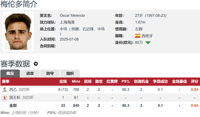 梅伦多当打之年,现年27岁,身高1.67米,矮个子技术流中场,左脚球员,主打前腰位置,也可以踢右边锋和中场,德转估价80万欧元。梅伦多上赛季共为加的斯在西乙联赛出场21次,其中8次首发,合计出场788分钟,贡献2球2助。